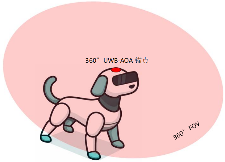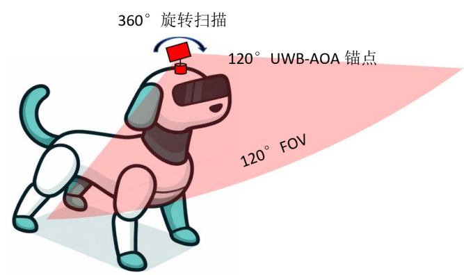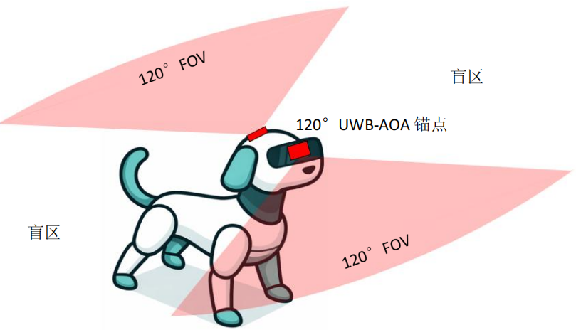 在机器人前方安装一个120°FOV(视场角)的UWB-AOA锚点。此方案软硬件设计难度不算大,但在机器人后方与侧方存在定位盲区,需要主人刻意走到机器人前方才能被定位到,或者机器人主动旋转才能找到主人的位置。此方案可以支持机器人在主人身后的有限自主跟随,但无法让机器人智能伴随在主人侧方甚至走在前方。