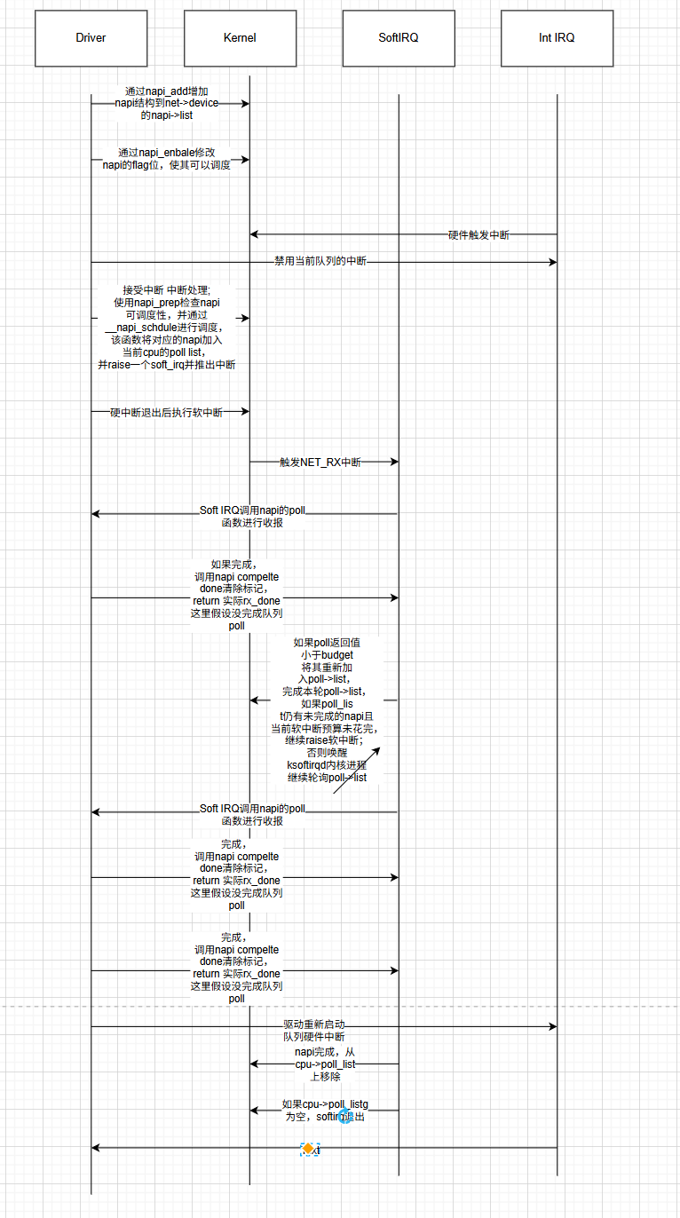 NAPI 是内核网络子系统与网卡驱动之间的收包协作机制。网卡收到数据后先触发硬中断,驱动在中断处理函数中关闭中断并调用 napi_schedule,将处理延后到软中断上下文。随后 NET_RX 软中断执行,内核调用驱动注册的 poll 函数批量收包,在预算用尽或队列为空时退出。若处理完成,驱动重新打开中断;若期间又有数据到达,则标记 MISSED,等待下一轮 poll。