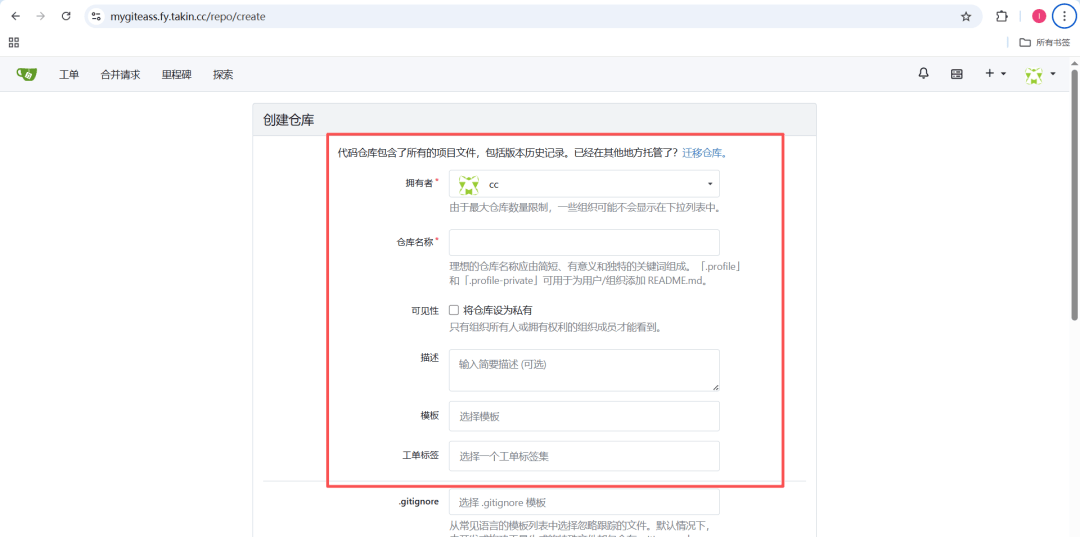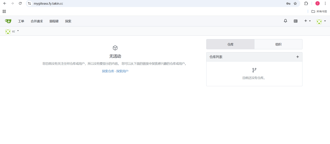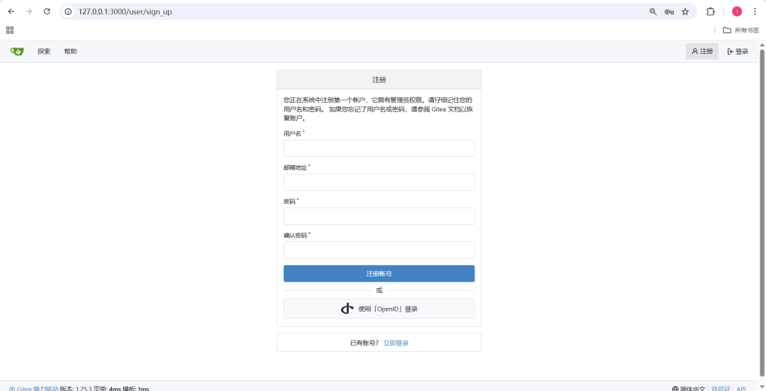 此时注册的第一个帐户,它拥有管理员权限。请仔细记住您的用户名和密码。如果您忘记了用户名或密码,请参阅 Gitea 文档以恢复账户。