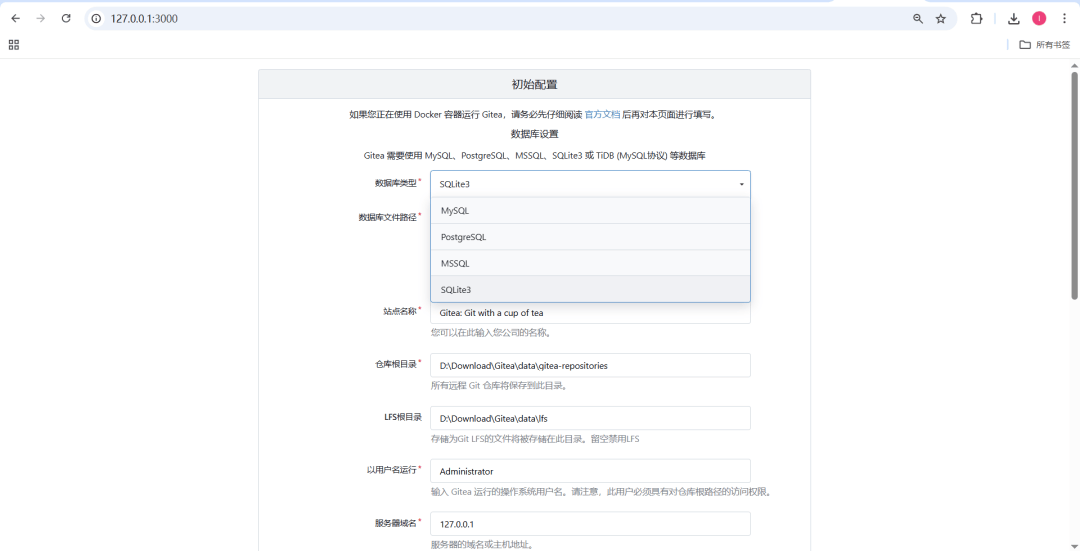 4. 我们在浏览器输入 http://localhost:30000 会打开初始化配置页面。在选择数据库类型的时候,您需要选择对应的数据库,我们这里选择SQLite3,您可以根据自己实际选择。然后往下拉到最后,选择立即安装。