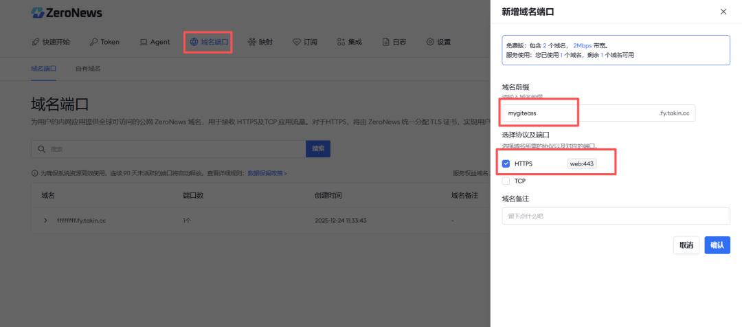 3. 接着,我们在域名端口页面,创建一个可用的公网域名(自定义前缀),并勾选HTTPS 协议端口。