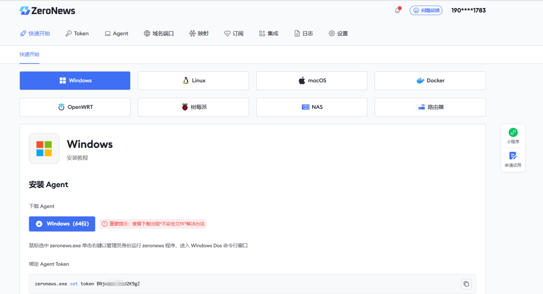 1. 首先,打开 ZeroNews 网站,然后选择您的系统(小编用的是用Win10,选择Windows即可),并按照对应的步骤和命令安装运行 Agent 服务。