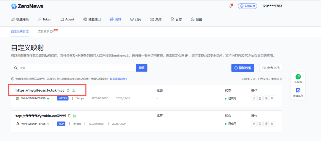 5. 按照上述步骤创建完成之后,我们就可以得到一条可公网访问的映射域名。