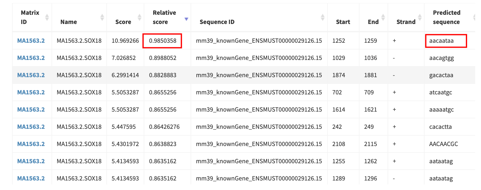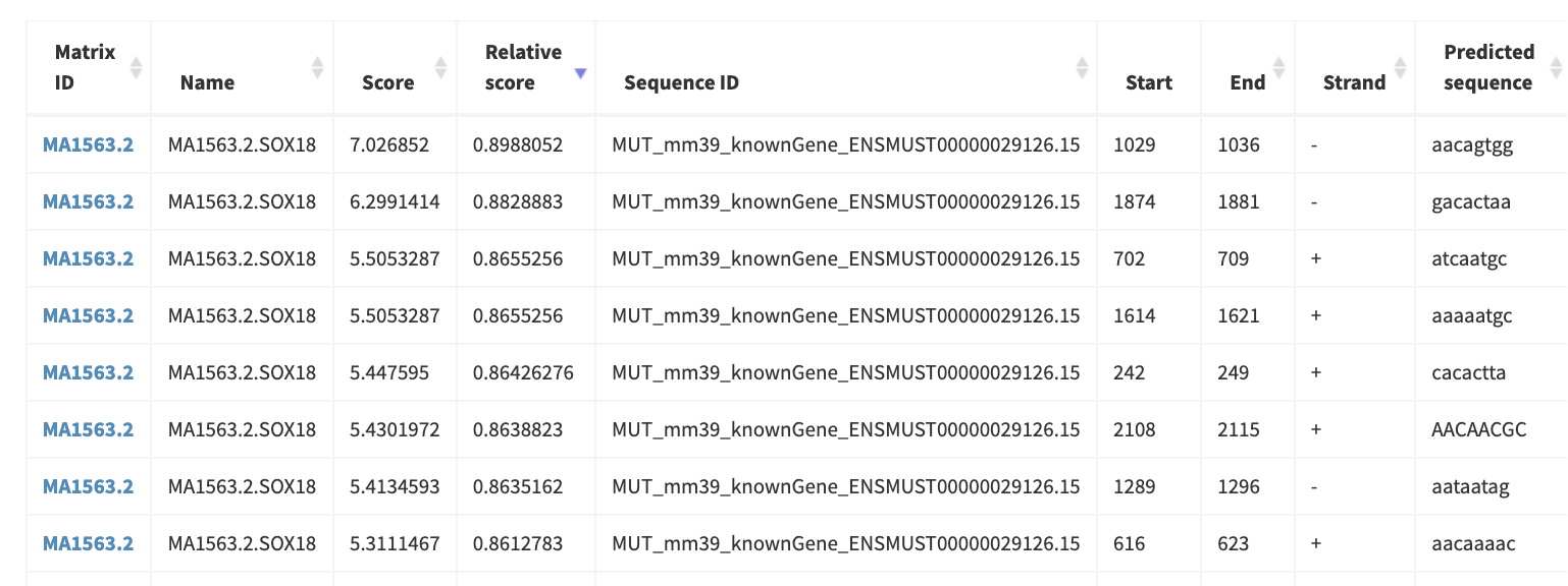 Matrix ID | Name | Score | Relative score | Start | End | Strand | Predicted sequence |