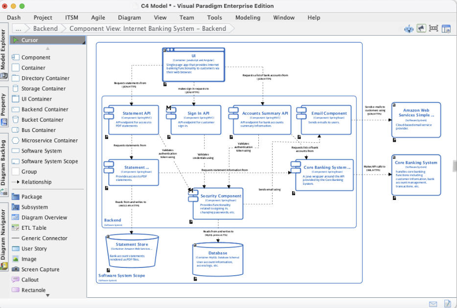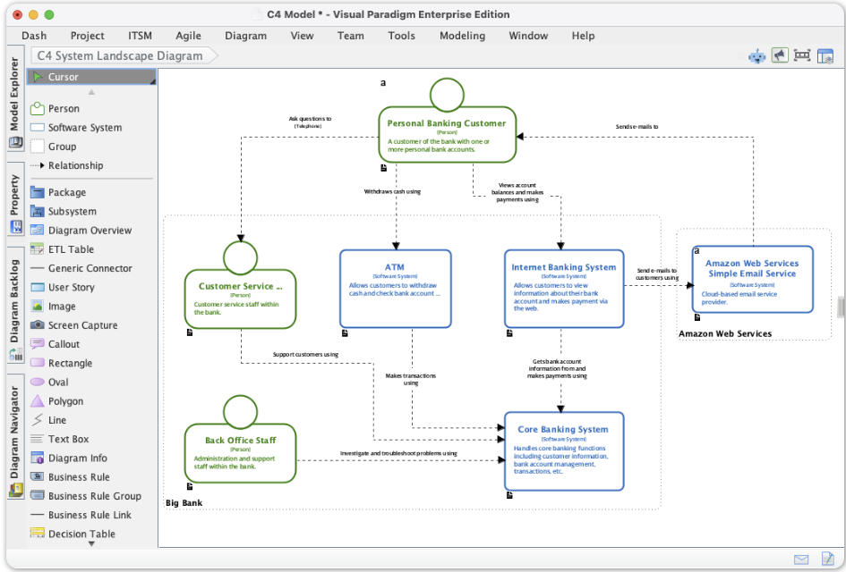 Visual Paradigm此次更新直接解决了这些问题。通过将 C4 模型深度集成到桌面端产品中,用户现在可以像使用 UML 或 BPMN 那样,调用专为 C4 设计的图形元素库。所有图表类型——包括 C4 系统全景图、系统上下文图、容器图、组件图、动态图和部署图——均已原生支持。这些图表不仅自动遵循 C4 官方推荐的视觉语法,还能在项目内保持样式与语义的一致性。
