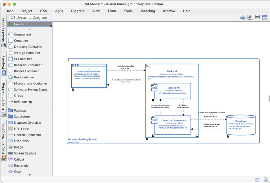 Visual Paradigm支持了C4模型行为的定义,架构师可以快速使用C4动态图定义组件间的交互,并用C4部署图将软件映射到硬件。