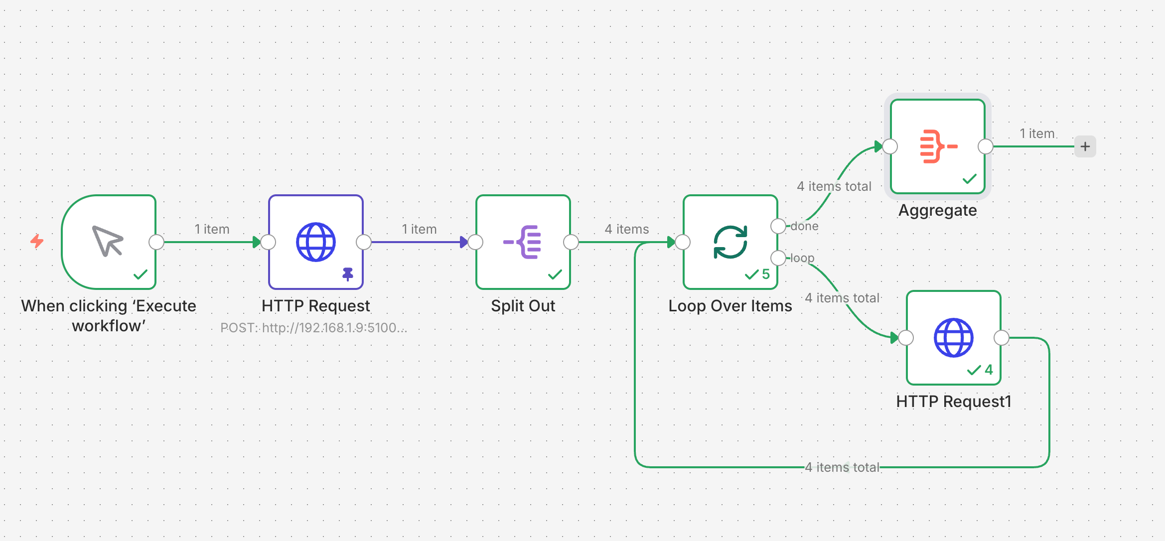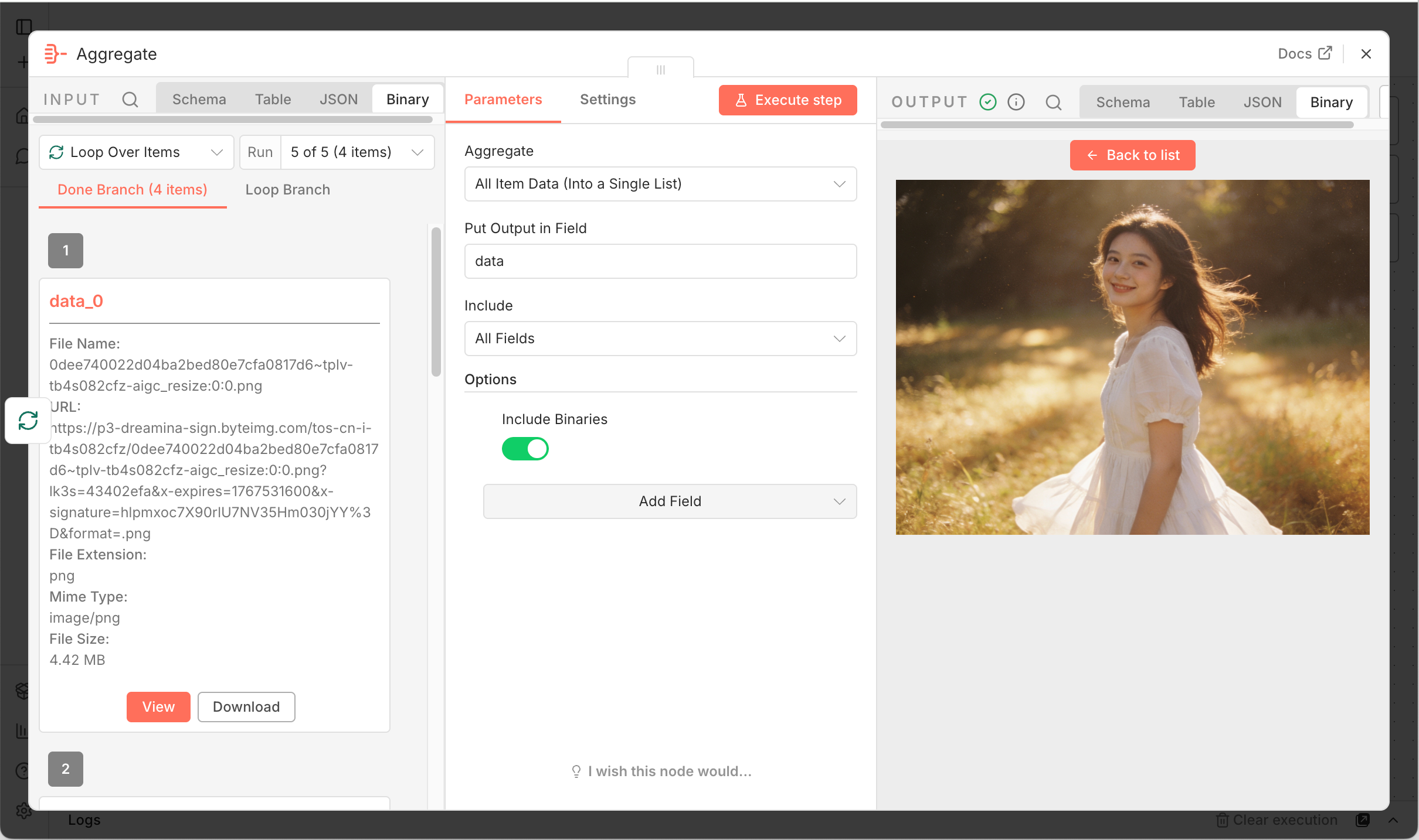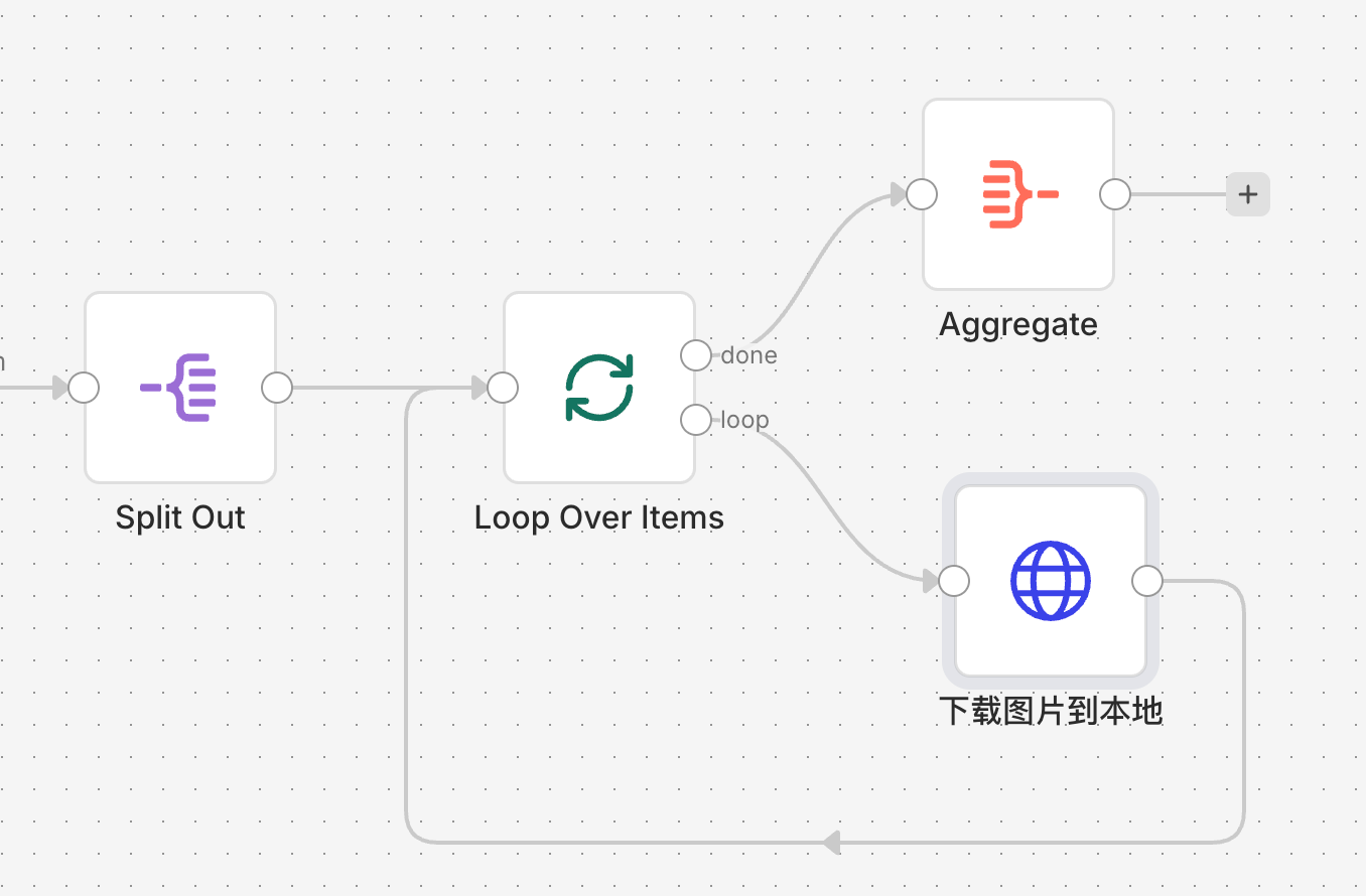 我在工作流里加了一个 Split Out 节点,把返回的图片数组拆成单条数据。接着通过 Loop Over Items 循环节点,配合 HTTP Request 节点把图片链接转化为二进制文件(Binary)。