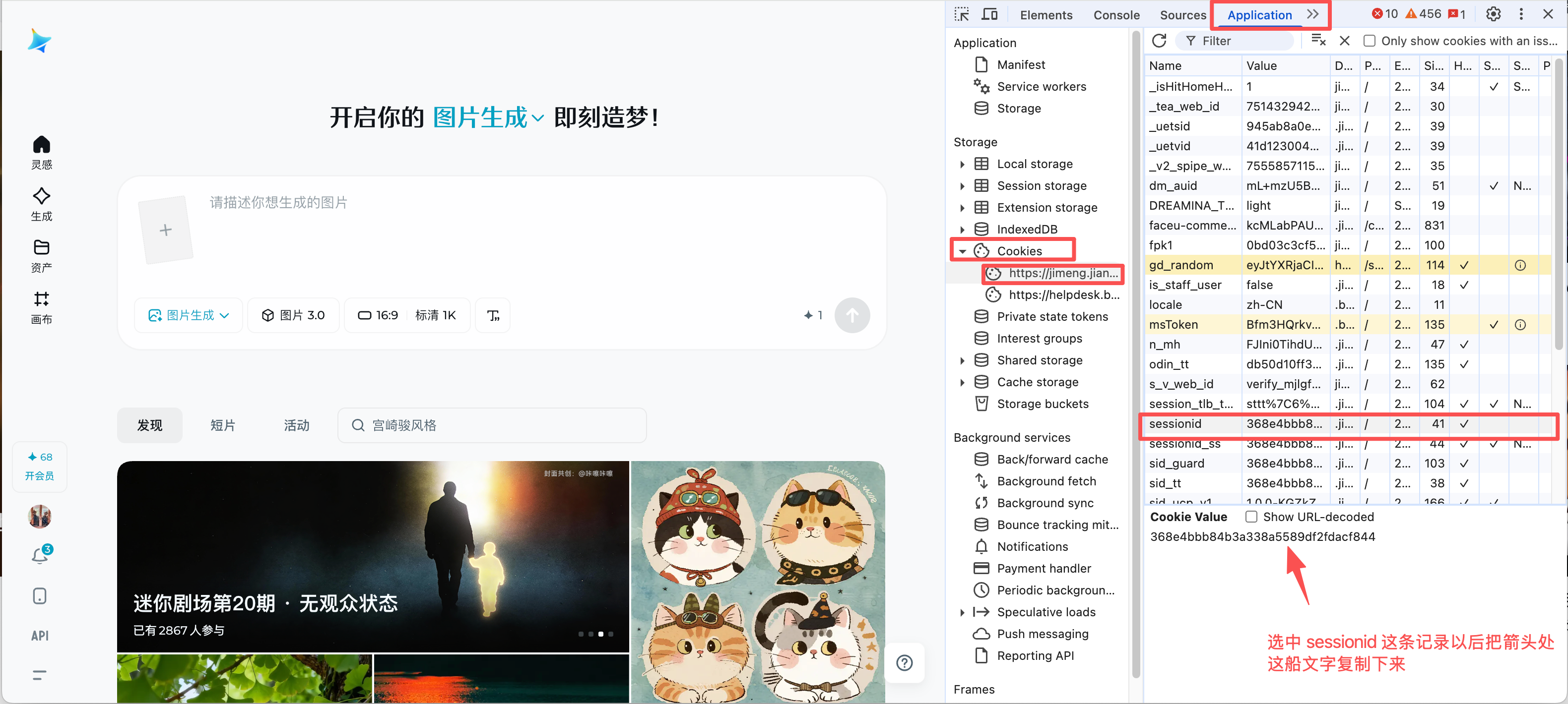 即梦毕竟是商业软件,不可能随便谁都能调。我们需要把自己的登录凭证拿给 API 服务用,这个凭证就是 sessionid。