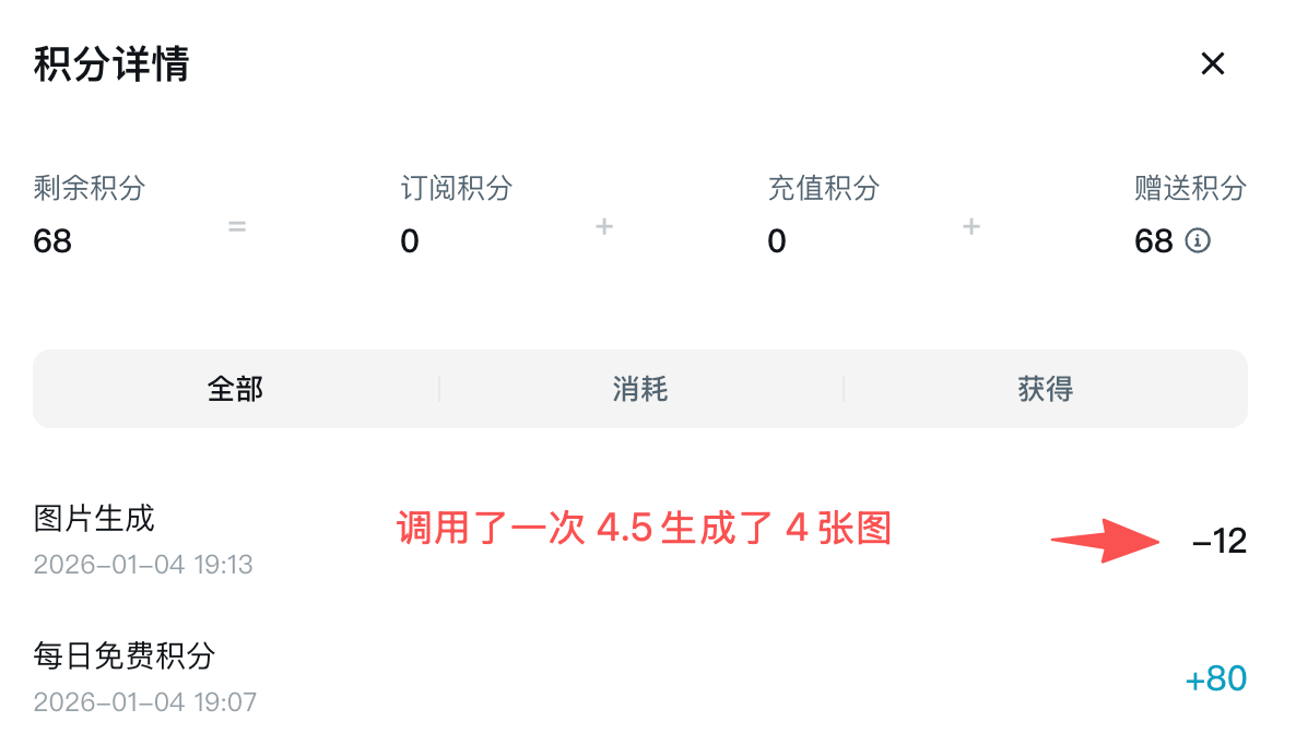 如果你像我一样选了 jimeng-4.5 模型,单张图是 3 积分,一次请求默认会生成 4 张图。这一波操作下去,12 积分就直接扣没了(普通模型是 1 积分一张)。大家调试的时候悠着点,别代码跑通了,号里的积分被循环跑空了。
