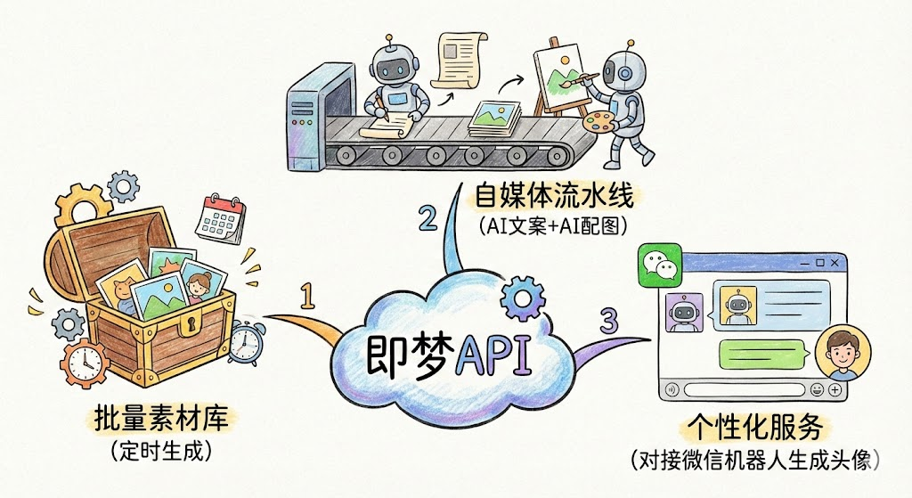 或者配合现在的 DeepSeek、ChatGPT,先把文章扔进去提炼画面描述,再传给即梦生成配图,最后自动发到社交媒体,全自动流水线就齐活了。