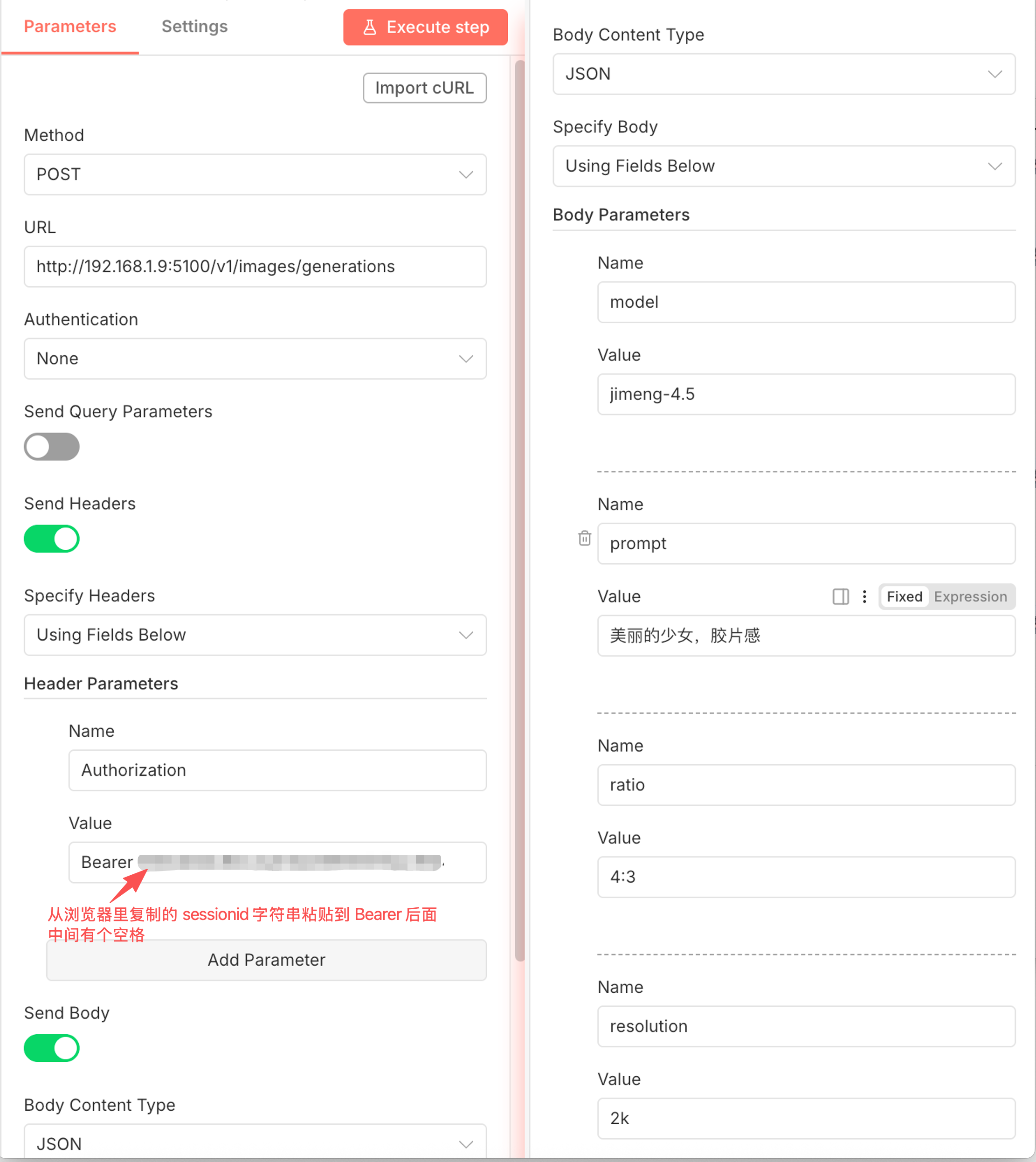 Authorization,值为 Bearer 加上刚才复制的 sessionid(注意中间有个空格)。jimeng-4.5,提示词 prompt 等。