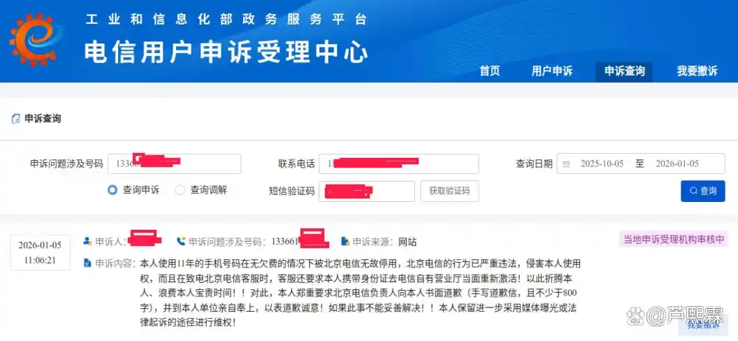 在多次与北京电信沟通无果后,李先生于2026年1月正式向工业和信息化部电信用户申诉受理中心提交投诉。申诉内容明确指出: