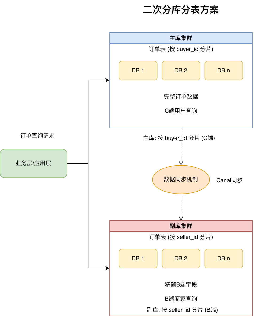 二次分库分表通常采用 “主库写成功后异步同步副库” 的机制。在主库完成数据写入事务后,通过异步双写或 Canal 监听 binlog 的方式,将数据变更同步到副库。