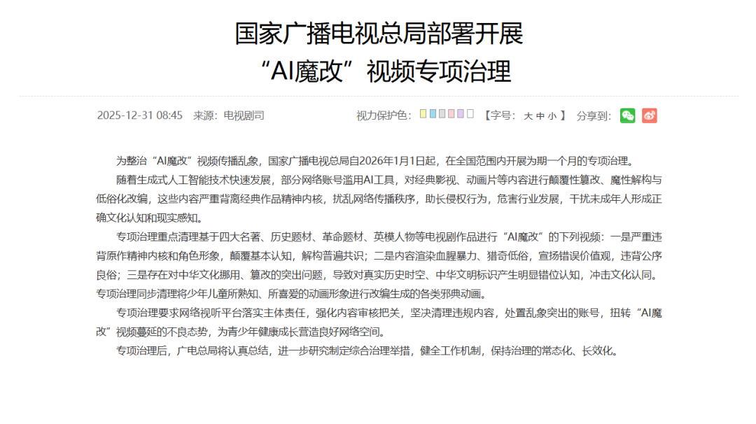 为整治“AI魔改”视频传播乱象,国家广播电视总局自2026年1月1日起,在全国范围内开展为期一个月的专项治理。