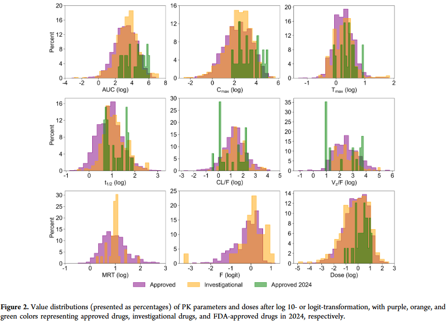 该数据集包含三类药物:已批准药物、在研药物及 2024 年获批药物,总计 1,283 种独特化合物、5,058 个化合物–剂量组合,涵盖八个 PK 参数。95% 以上数据来自临床 PK 研究,时间跨度为 1971–2024 年。数据经过严格人工整理,仅保留口服给药、健康成人(或特定情况下的患者)、单一给药方案、血浆/血清/全血测定等符合条件的记录,并对剂量与 PK 参数值进行对数或逻辑转换以稳定训练。分子化学多样性较高,不同药物类别间的相似度较低。