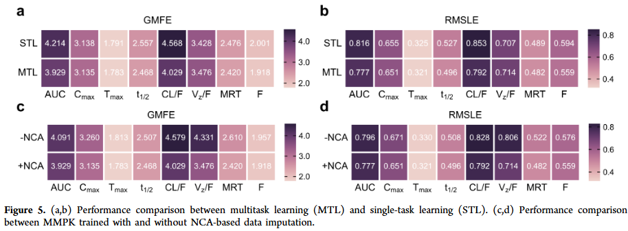 多任务学习(MTL)优于单任务学习(STL),在 AUC 和 CL/F 等参数上提升明显。利用 NCA 关系对 AUC、CL/F、Vz/F 进行数据插补,提高了参数共现度,缓解了数据稀疏性,显著提升了 CL/F 与 Vz/F 的预测准确性。