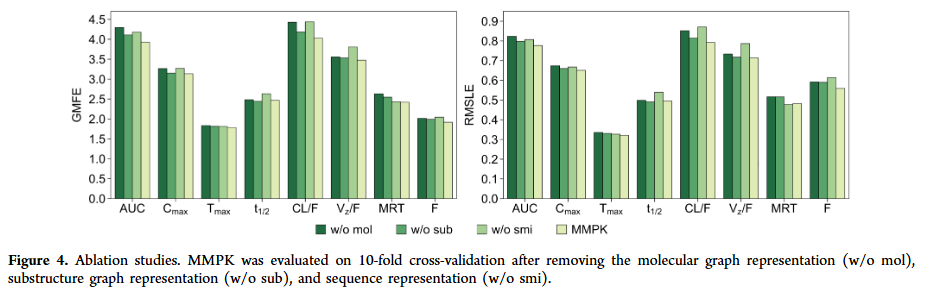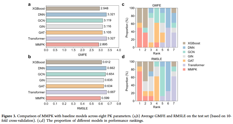 MMPK 在 10 折交叉验证下的平均 GMFE 为 2.895,RMSLE 为 0.599。在 Tmax、t1/2、MRT 和 F 上表现最佳,而 AUC、Cmax、CL/F、Vz/F 因数值跨多个数量级,预测难度更高。与 XGBoost、DNN、GCN、GIN、GAT、Transformer 等基线模型比较,MMPK 在大多数参数上排名前二,整体性能优越。