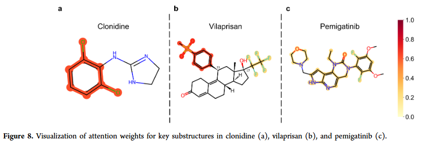 MMPK 的子结构注意力机制可量化各子结构对预测的贡献,能够识别与 PK 相关的重要化学基团。例如:Clonidine 的 2,6-二氯苯环、Vilaprisan 的 4-(甲磺酰基)苯基和 17α-五氟乙基、Pemigatinib 的三环核心及取代基,均与已知活性和 PK 特征吻合。