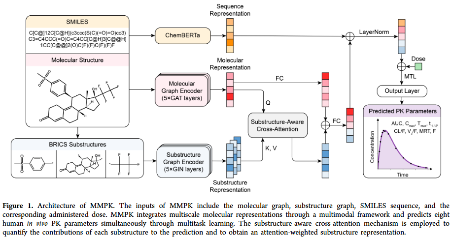 深度学习(DL)方法,尤其是图神经网络(GNN)、迁移学习和自监督预训练,近年来在分子性质预测中表现突出。多模态学习可融合来自不同分子表示的多尺度特征,为全面捕捉影响 PK 的化学、生物和药学因素提供了新思路。本研究聚焦人体口服 PK 参数预测,构建了迄今最大规模的公开数据集,并提出融合分子图、子结构图与 SMILES 序列的多模态深度学习框架 MMPK,同时引入给药剂量、多任务学习和基于非房室模型分析(NCA)的数据插补,以提升模型性能与可解释性。
