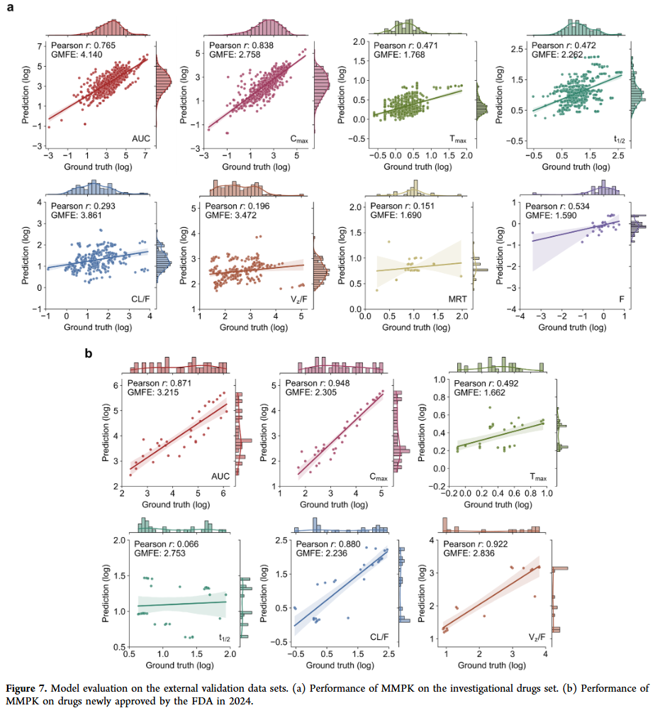 在在研药物集上,MMPK 平均 GMFE 为 2.693,RMSLE 为 0.589;在 2024 年获批药物集上,GMFE 为 2.501,RMSLE 为 0.474,且多数参数相关性较高。部分参数(如 CL/F、Vz/F、MRT)相关性较低,可能与其推导性质或分布差异有关。整体结果表明 MMPK 对结构多样化合物具有较好泛化能力。