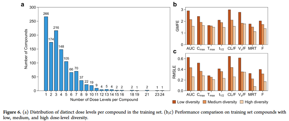 剂量水平多样性高的化合物预测性能显著优于剂量水平单一的化合物,表明多剂量数据有助于模型学习剂量–暴露关系。