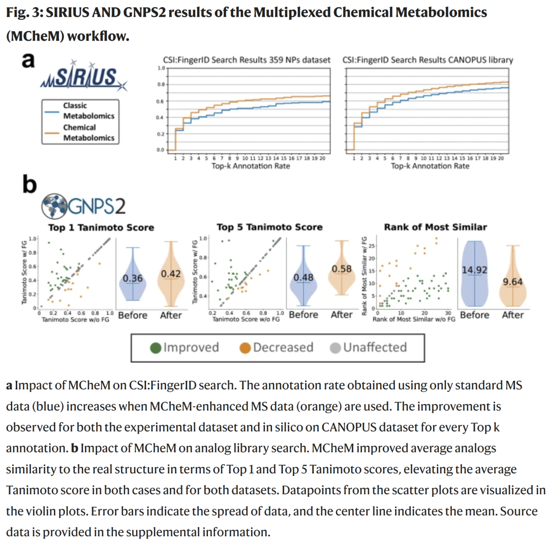 在 359 种天然产物标准品的验证中,三类反应均表现出高度特异性,假阳性仅占 3.6%。将 MCheM 数据整合进 CSI:FingerID 查询后,实验数据中约 49% 的谱图排名提升,其中 20% 进入前三名,6% 升至第一。利用大规模公开数据集模拟加入官能团信息,也观察到 32% 的谱图排名改善。
