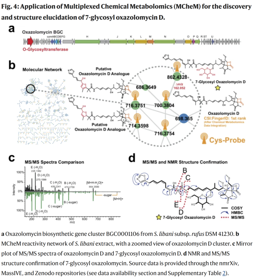 研究人员将 MCheM 应用于基因组指导的天然产物发现。在分析 Streptomyces libani subsp. rufus DSM 41230 的发酵提取物时,通过反应 A 成功捕获了 β-内酯特征信号,使得原本未进入常规搜索前列的氧唑霉素 D 在 MCheM 辅助排名中升至第一位。进一步的分子网络分析发现多个结构相关、含糖基修饰的氧唑霉素类似物,其中一种分子质量差与己糖基一致,并通过 NMR 和 MS/MS 确证为 7-糖基氧唑霉素 D,这是该化合物家族中首个被报道的糖基化成员。