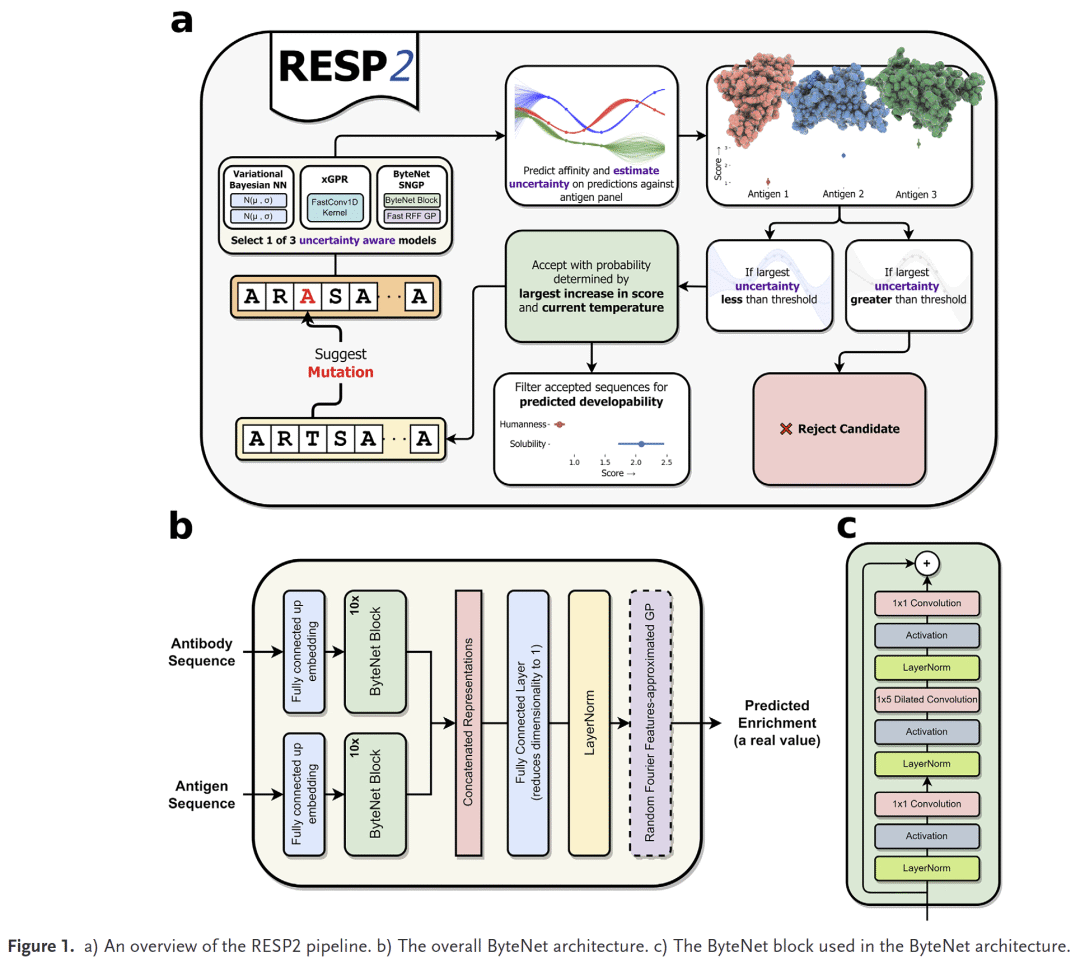 研究人员在先前工作中提出了RESP,一个基于机器学习的抗体发现管道,能够识别与特定靶点高亲和结合的抗体。其特点是采用了不确定性感知模型,避免不当外推,并通过体外模拟定向进化寻找结合紧密的候选物。在此次研究中,研究人员对RESP进行了扩展,开发了RESP2,支持多抗原并行优化,并引入了两个新的不确定性感知模型,还整合了一个基于1.3亿条人源抗体序列训练的生成模型,用于评估候选物的人源性和可开发性。
