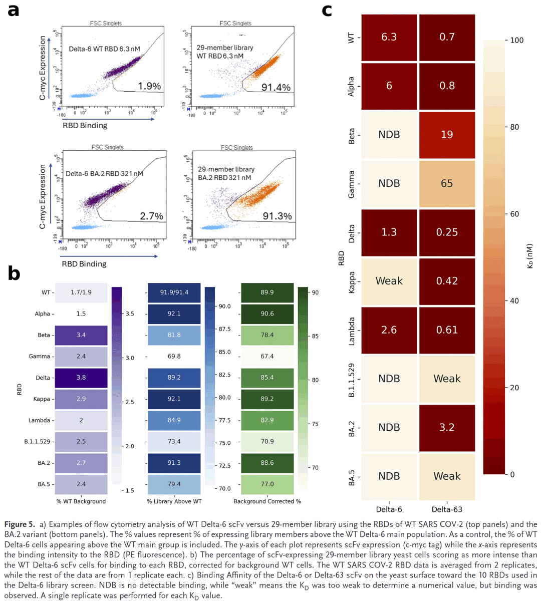 研究人员选择了对Delta变体RBD有有限亲和力的Delta-6抗体作为起点,利用RESP2进行单轮筛选和测序。结果发现了一种名为Delta-63的人源化抗体,对包括BA.2在内的多个RBD变体均展现出高亲和力,其中对BA.2的结合力达到纳摩尔级,而原始抗体几乎无结合活性。