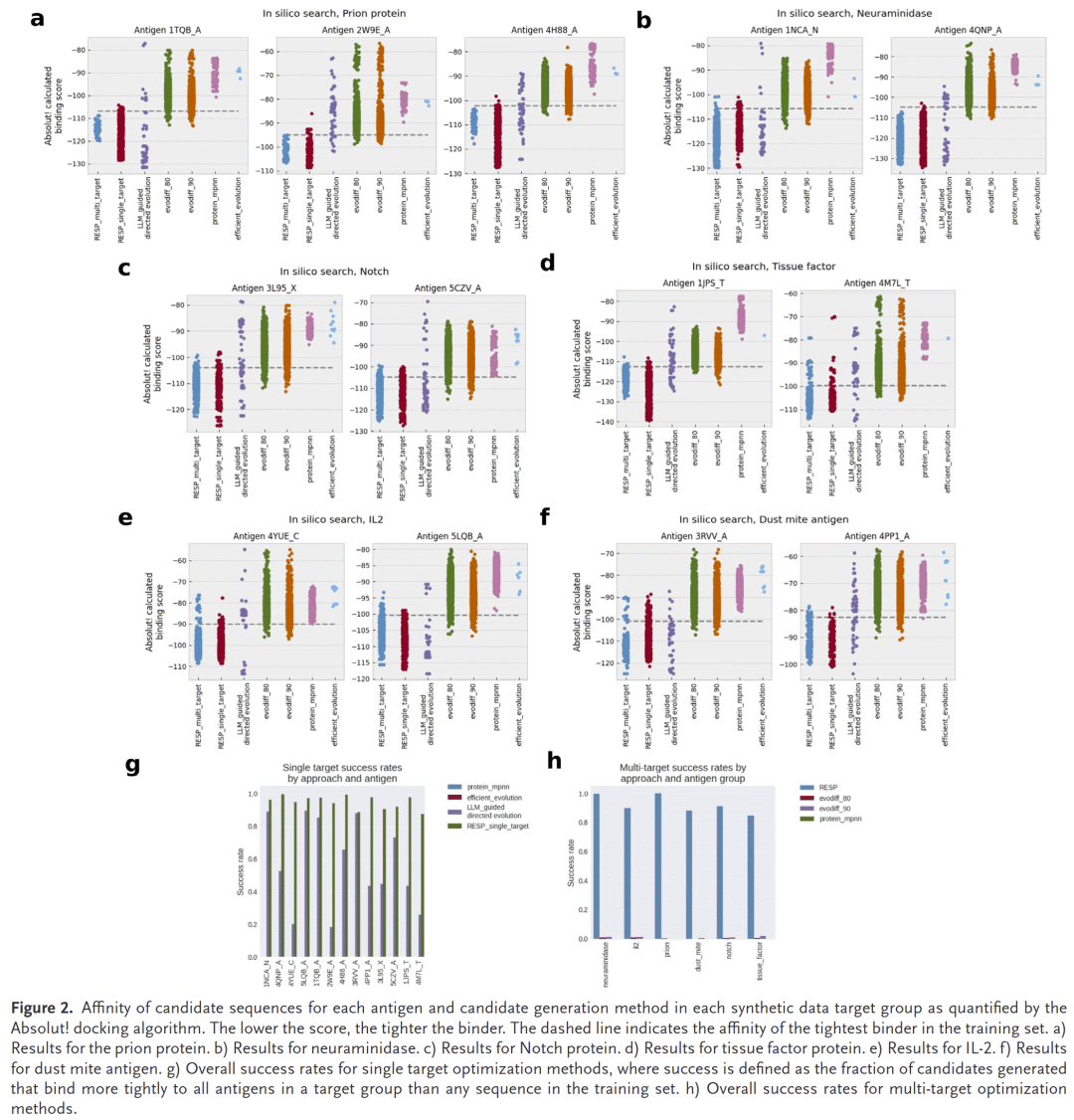 在Absolut! 抗体数据库的13种抗原上进行测试,RESP2始终表现出优于其他AI方法的成功率,≥85%,而流行生成式AI方法的成功率低于1.5%。这表明RESP2在多靶点、多参数优化方面显著优越。