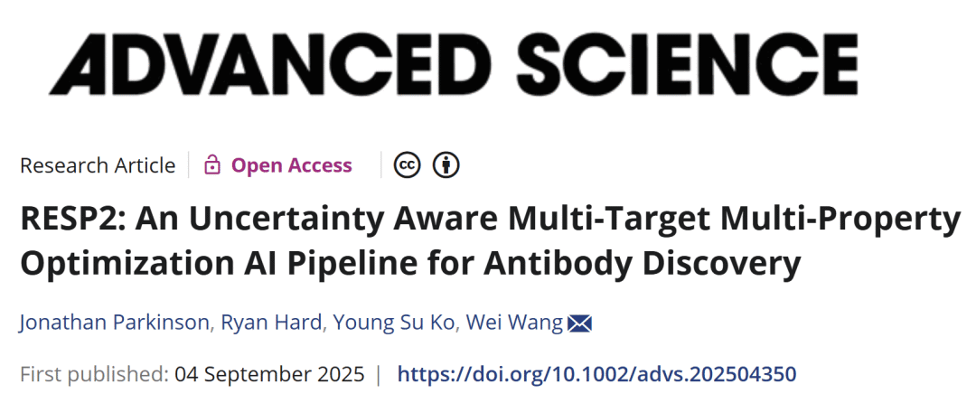 J. Parkinson, R. Hard, Y. S. Ko, and W. Wang, “ RESP2: An Uncertainty Aware Multi-Target Multi-Property Optimization AI Pipeline for Antibody Discovery.” Adv. Sci. (2025): e04350.