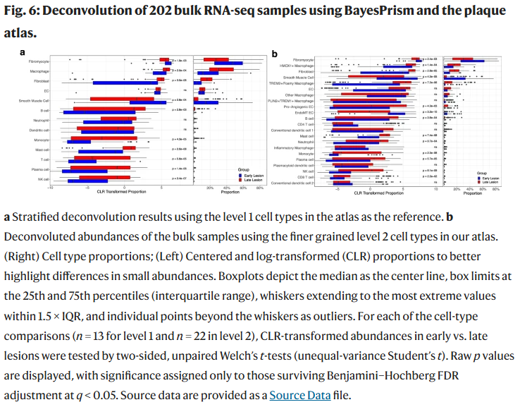 通过图谱,研究人员比较了早期与晚期颈动脉斑块的细胞组成。结果发现: