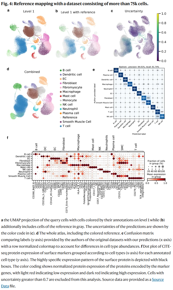 研究人员利用图谱对独立的颈动脉斑块数据进行自动注释,结果显示与专家注释高度一致,精确度达 94%。同时,CITE-seq 表面蛋白水平验证进一步证明了注释的可靠性。研究人员提供了便捷的 Web 平台和 Docker 工具,使科研人员无需复杂编程即可快速完成数据注释。