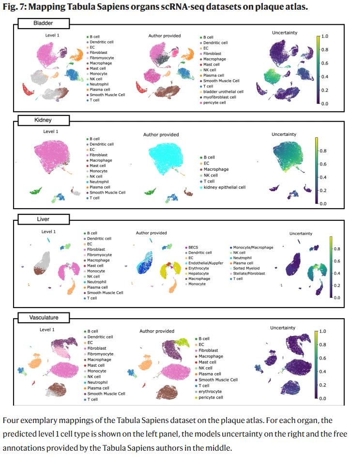 研究人员利用该图谱对其他器官的单细胞数据进行映射,发现纤维肌母细胞主要存在于血管组织,证实其血管特异性。同时,泡沫状巨噬细胞在肺组织中也有分布,符合已知文献。整体结果显示,该图谱不仅适用于斑块研究,也能区分不同组织环境下的细胞类型。