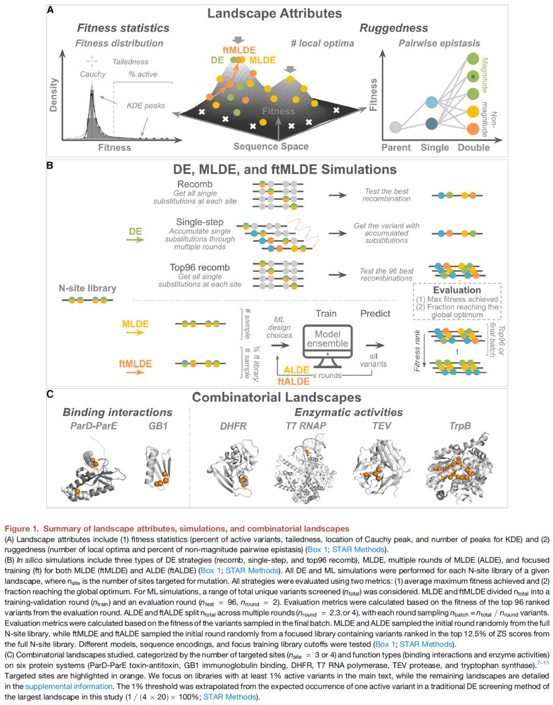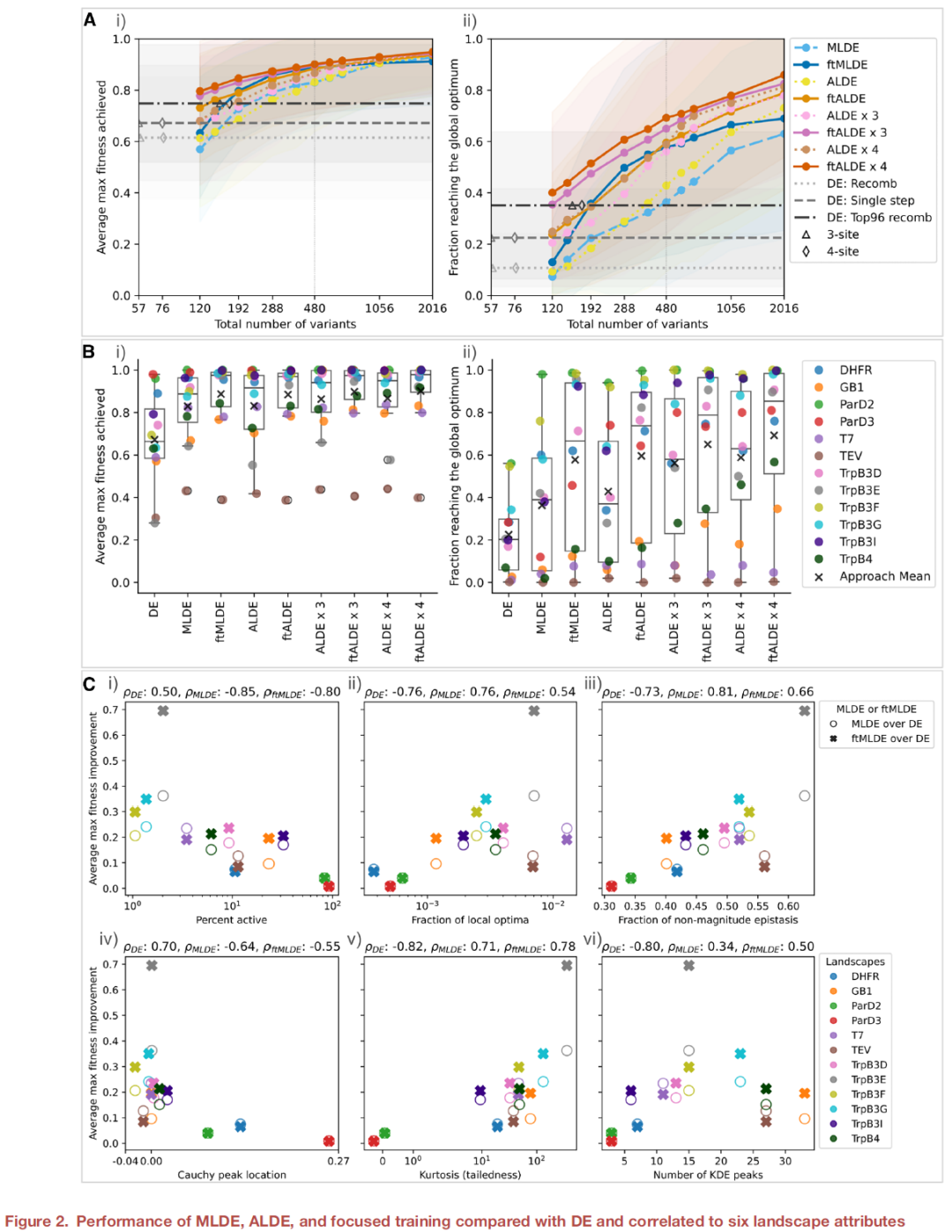 机器学习辅助定向进化(MLDE)被证明比传统定向进化(DE)更高效地发现高适应性蛋白质变体。然而,不同蛋白背景下 MLDE 性能的差异尚未被充分理解,导致实验室应用中缺乏最佳策略选择。研究人员系统评估了多种 MLDE 策略(包括主动学习与基于零样本预测器的聚焦训练),在 16 种不同的蛋白适应度景观中进行了对比。结果表明,MLDE 在 DE 难以导航的复杂景观中具有更大优势,尤其是当聚焦训练与主动学习结合时效果最佳。零样本预测器提供的进化、结构与稳定性先验信息显著提升了模型性能。研究总结了不同策略在不同景观条件下的适用性,并提出了可供蛋白质工程实践参考的策略选择指南。
