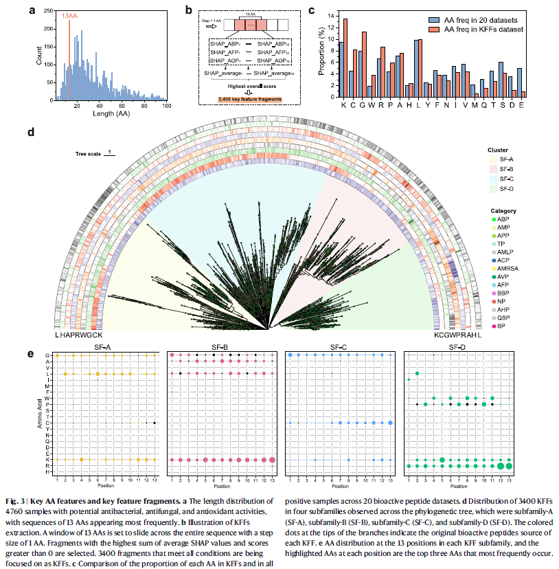 从这些序列中提取的13AA片段(KFFs)整合了三类活性特征。3400个KFF经系统发育分析被划分为四个亚家族,每个亚家族显示独特的氨基酸分布特征。