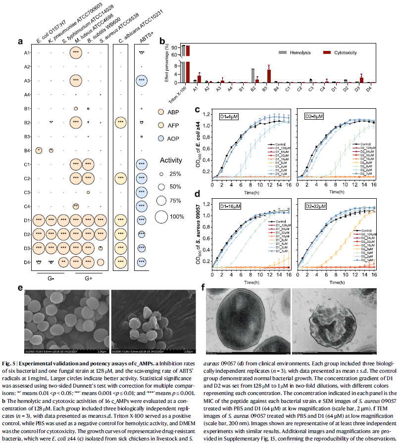 在6种细菌(3种革兰阴性、3种革兰阳性)和1种真菌(C. albicans)中,约75%的c_AMPs表现出显著抑菌或抑真菌活性。尤其是 D1与D2,在多种细菌中均表现出广谱抗菌效应,并在抗氧化实验中显示出较高自由基清除能力。溶血与细胞毒性实验表明,除B2外,其他15条肽的溶血率均低于4%,安全性良好。