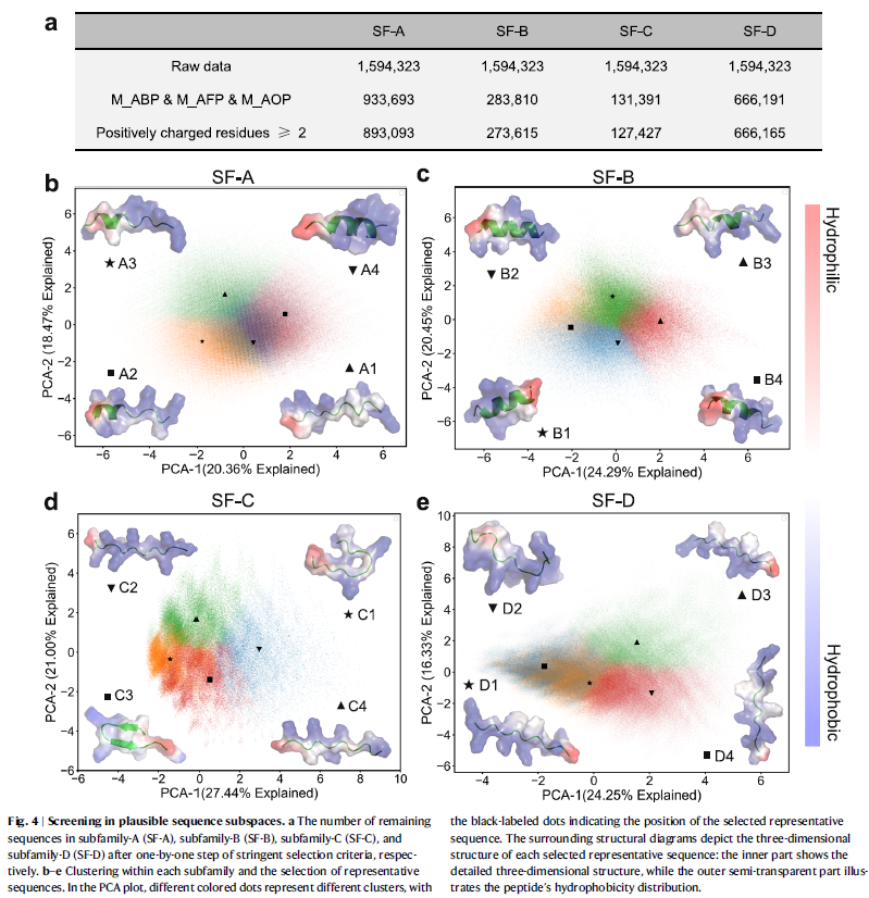 每个亚家族的3¹³组合空间经过深度学习预测和正电荷过滤后,保留约89万到66万条高概率活性序列。通过K-means聚类与特征降维,选取16条代表性候选肽(c_AMPs)进行合成与实验验证。