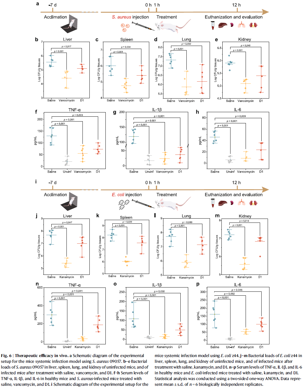 在感染小鼠脓毒症模型中,D1显著降低了肝、肾、脾、肺中的细菌负荷(下降0.4–1.1 log CFU/g),并有效减轻炎症反应。TNF-α、IL-1β与IL-6等炎症因子水平显著下降,说明其具备抗炎与抗感染双重效应。