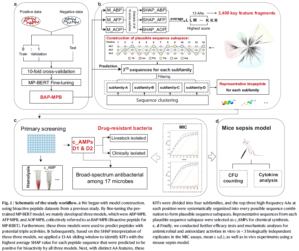 深度学习模型在抗菌肽(AMP)设计与优化中展现出巨大潜力,但现有方法仍存在成功率低或虚拟文库规模过大的问题。本研究提出了一种名为 DLFea4AMPGen 的新策略,通过深度学习模型识别并提取与抗菌肽活性相关的关键特征,从而生成具有潜在生物活性的肽序列。研究人员利用 SHAP(Shapley Additive Explanations) 方法定量评估多功能肽中每个氨基酸对抗菌、抗真菌和抗氧化活性的贡献,并提取出平均贡献最高的关键特征片段(KFFs),再根据氨基酸频率将其分为四个亚家族。通过系统组合这些高频氨基酸,构建出合理的候选序列空间,最终选取16条代表性序列进行实验验证。结果显示,其中12条(75%)至少具备两种以上活性,尤其是 D1 表现出对多重耐药临床病原菌的广谱抗菌能力(体内外均有效)。该研究验证了DLFea4AMPGen平台在高效设计与筛选生物活性肽方面的潜力,为AMP研究提供了新方向。