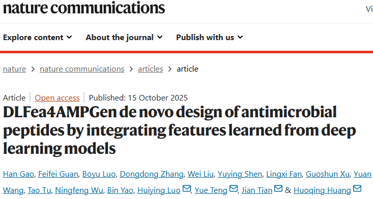 Gao, H., Guan, F., Luo, B. et al. DLFea4AMPGen de novo design of antimicrobial peptides by integrating features learned from deep learning models. Nat Commun 16, 9134 (2025).