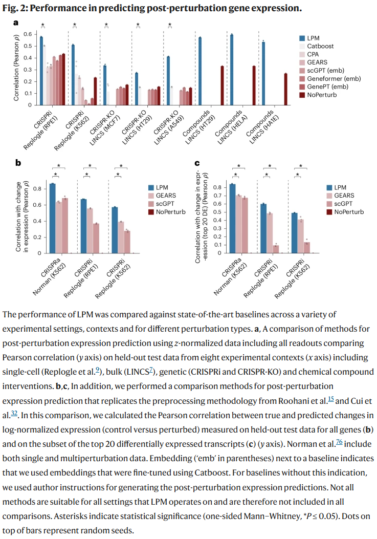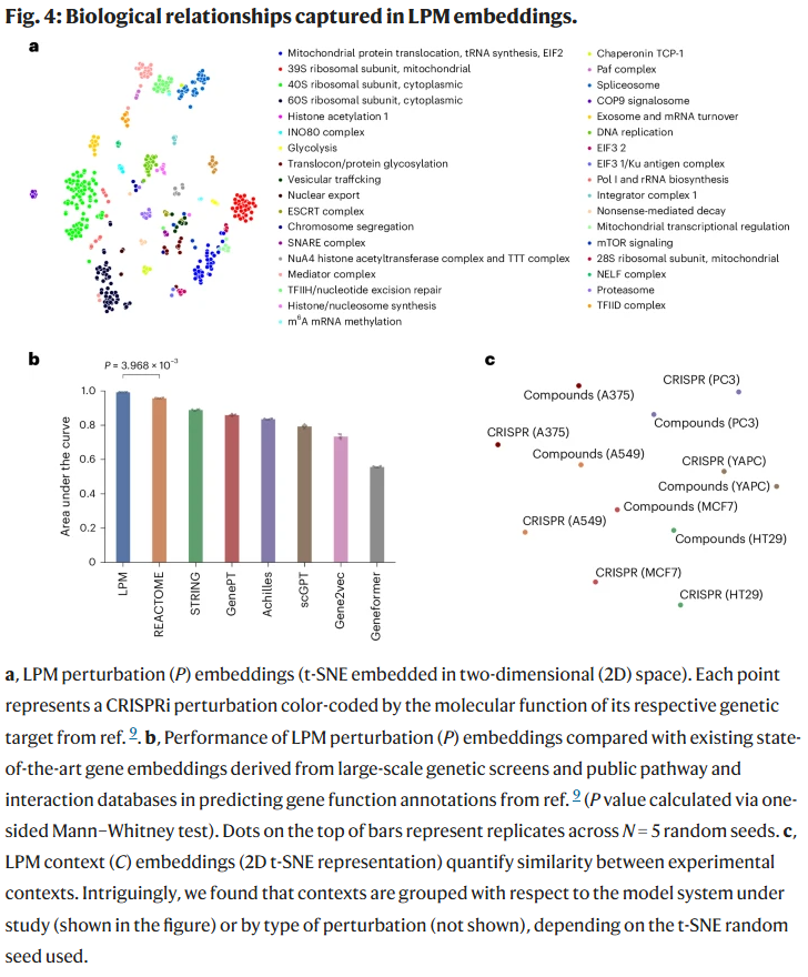 此外,通过t-SNE可视化,LPM学习到的上下文嵌入能自动区分实验系统(如不同细胞系),表明模型在潜在空间中捕获了生物语义信息。
