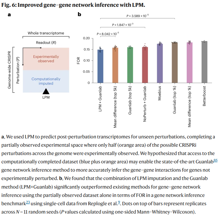 结果显示,在原始实验数据中加入由LPM生成的推断性扰动结果后,推断得到的基因–基因网络在**假阴性率(False Omission Rate, FOR)**等指标上显著改善。这一结果表明,LPM不仅能补全未观测扰动实验,还能提升下游因果网络推断的准确性,说明其学习到的扰动–响应模式在统计上具有因果一致性。
