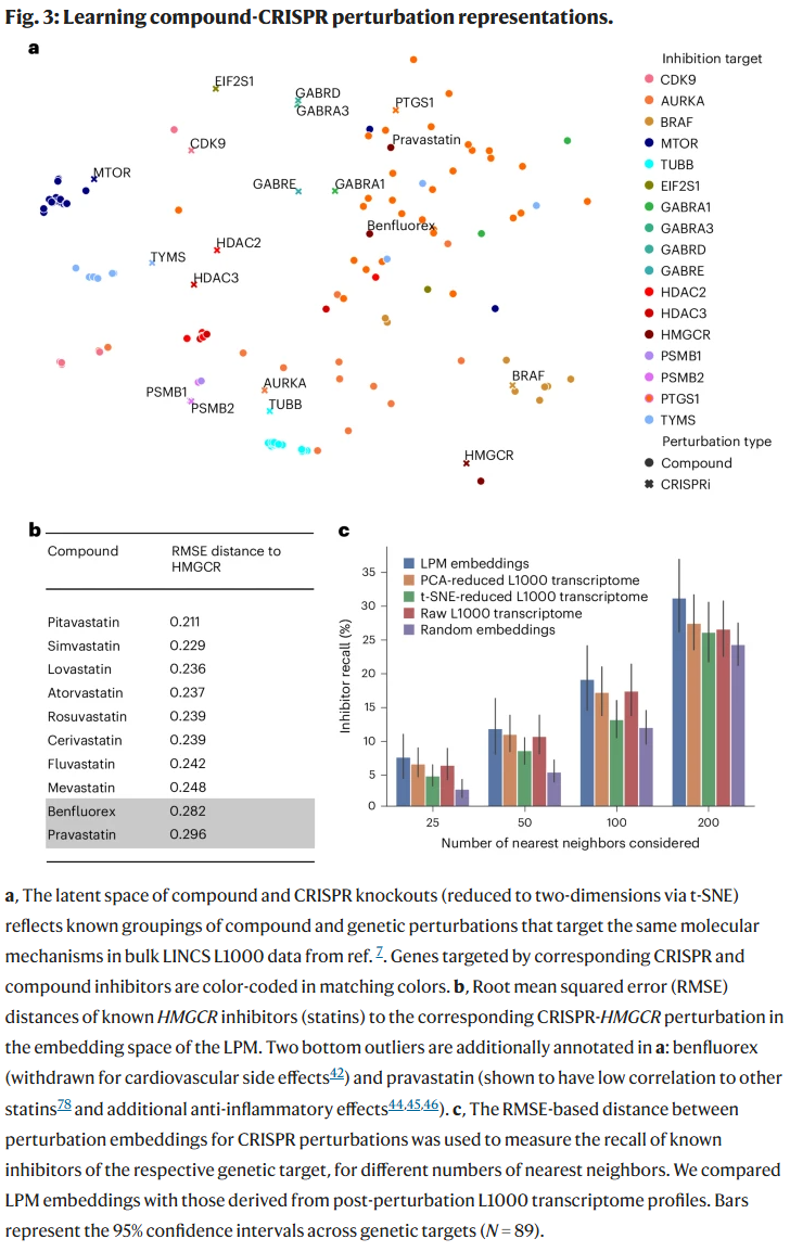 研究人员将LPM应用于LINCS数据库中的大规模化学与遗传扰动实验,统一学习两者的潜在空间。结果显示,药物抑制剂与其对应的基因CRISPR干扰常被聚类在相邻位置,例如MTOR抑制剂与MTOR基因敲降的扰动聚集在一起。
