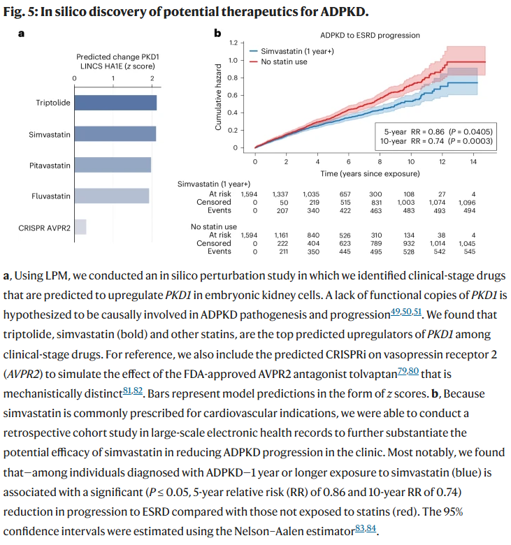 LPM在体外数据基础上预测能上调PKD1表达的临床药物,结果发现三七皂苷(triptolide)与辛伐他汀(simvastatin)**位列前列。随后利用真实世界健康记录进行回顾性验证,结果显示长期服用辛伐他汀的患者,其肾衰进展风险显著下降。这一研究展示了LPM在发现候选治疗药物方面的强大潜力。