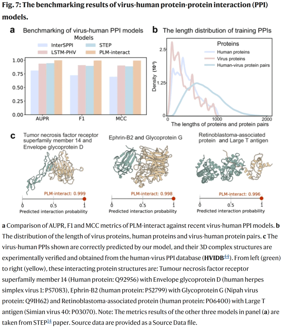 PLM-interact 还在病毒–宿主互作预测任务中展示卓越性能。研究人员基于 HPIDB 数据库训练病毒–人类 PPI 模型,并与 STEP、LSTM-PHV、InterSPPI 等方法对比。