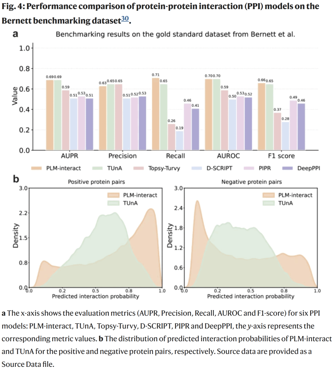 进一步分析发现,模型的提升主要来源于对真阳性互作的准确识别。PLM-interact 对真实互作的预测概率更高,而对非互作的置信度更低,表现出良好的判别能力。