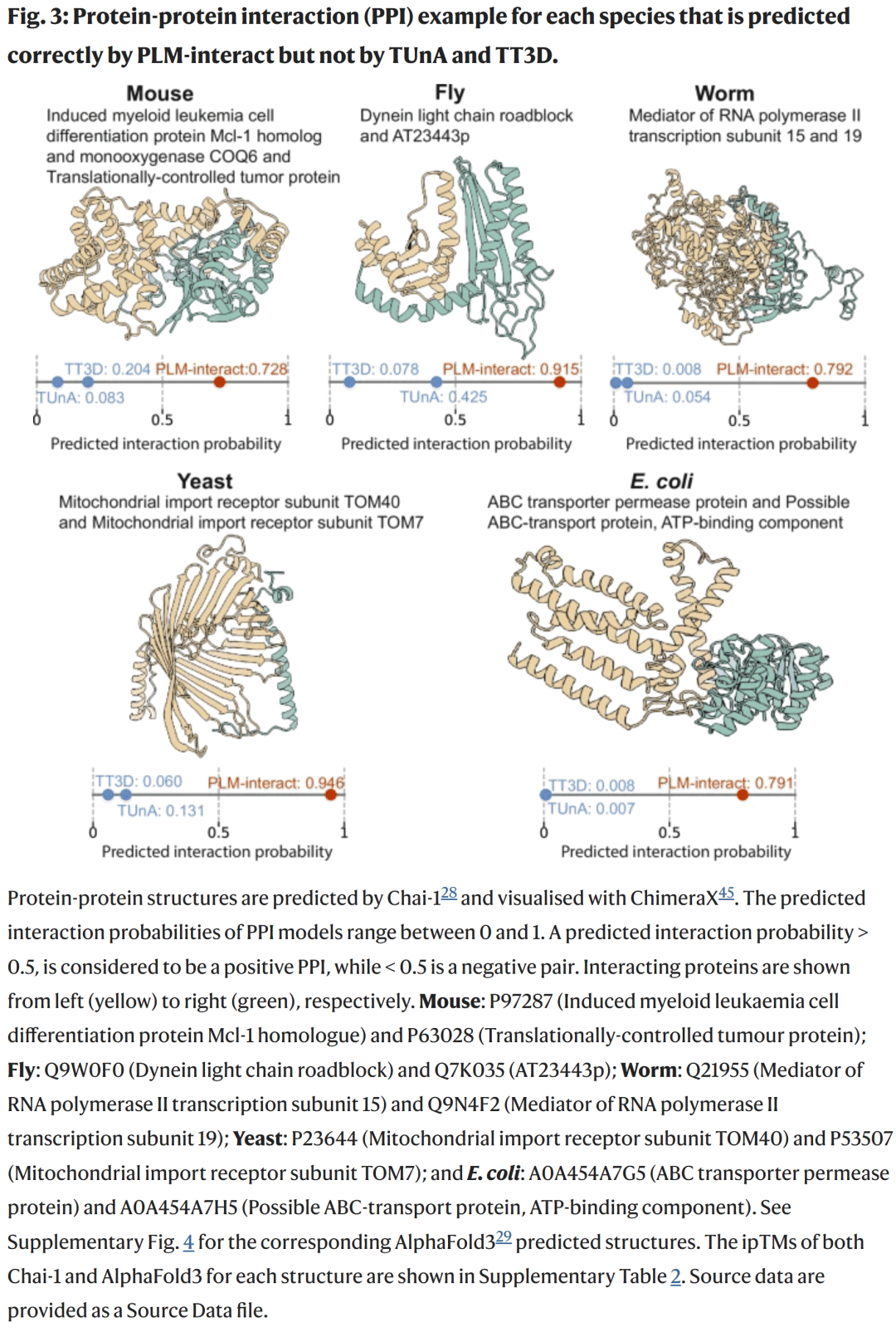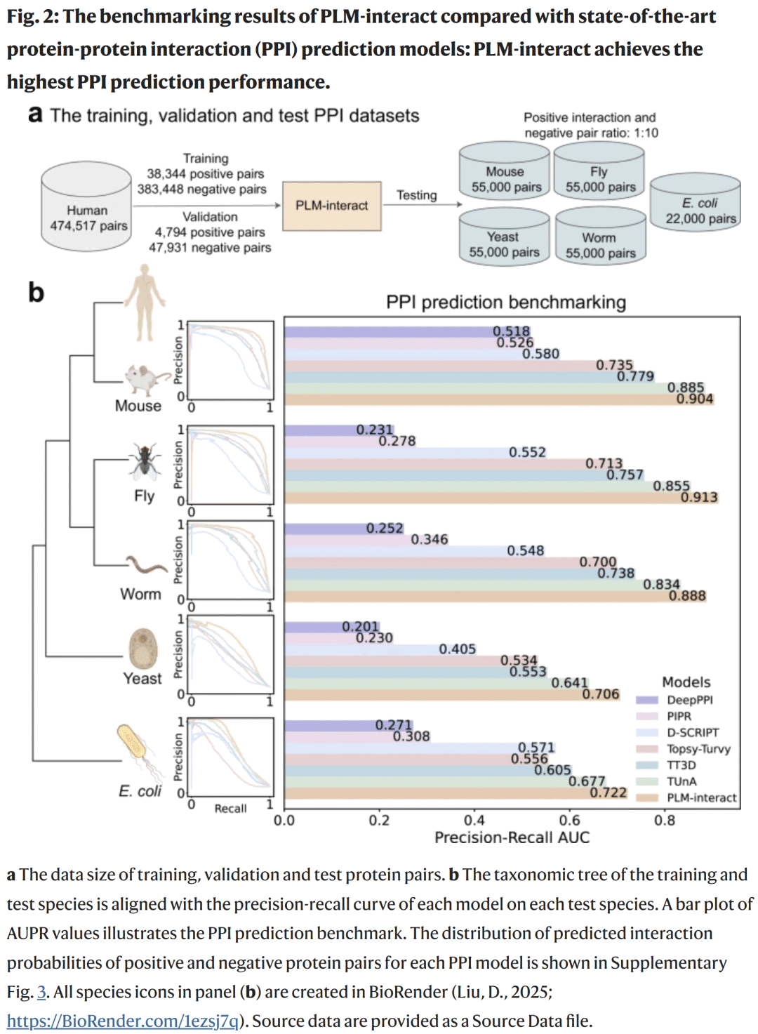 PLM-interact 证明了蛋白语言模型可从单链序列扩展至分子交互层面。与传统基于静态嵌入的分类器不同,该模型在训练中直接学习跨蛋白残基的依赖关系,从而捕捉真实的互作语义。