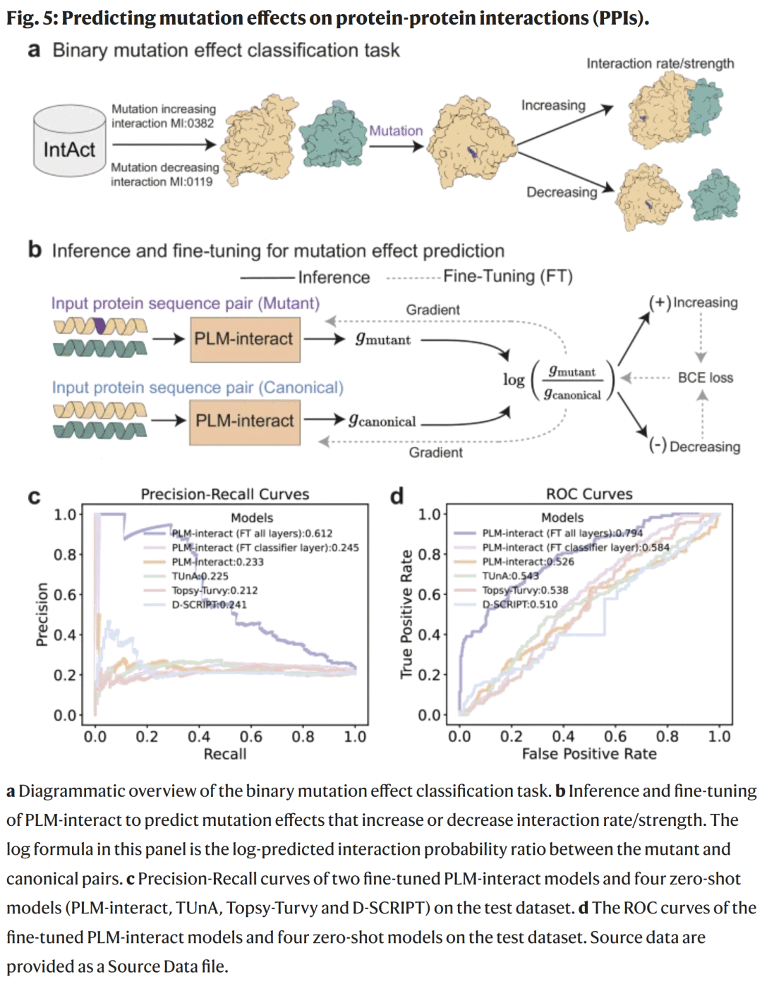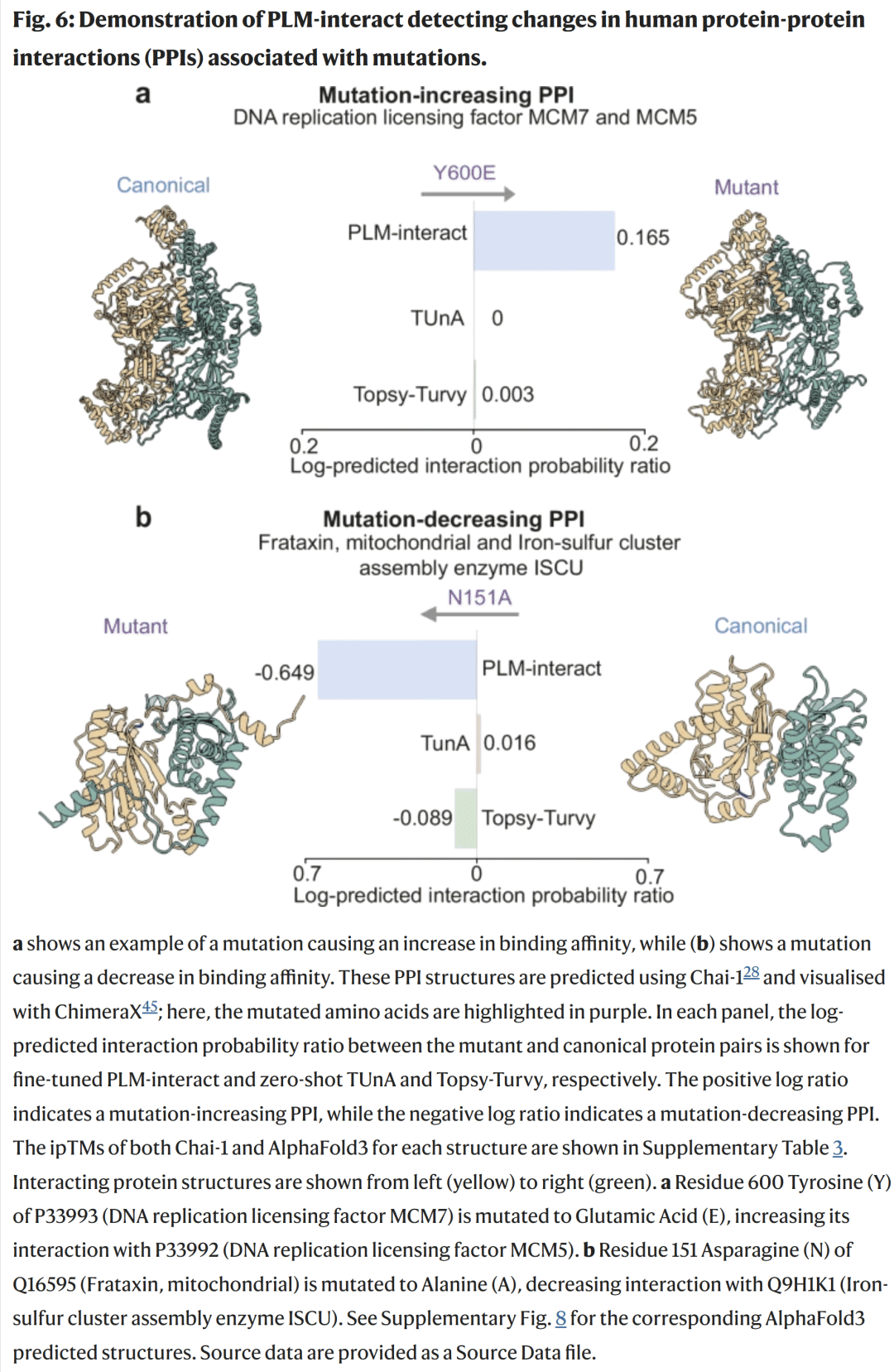研究人员进一步验证 PLM-interact 预测突变对 PPI 的影响能力,使用 IntAct 数据集中 6979 个带注释的突变实例。通过微调策略,模型学习突变前后互作概率变化的对数比值,判断突变是否增强或削弱结合。