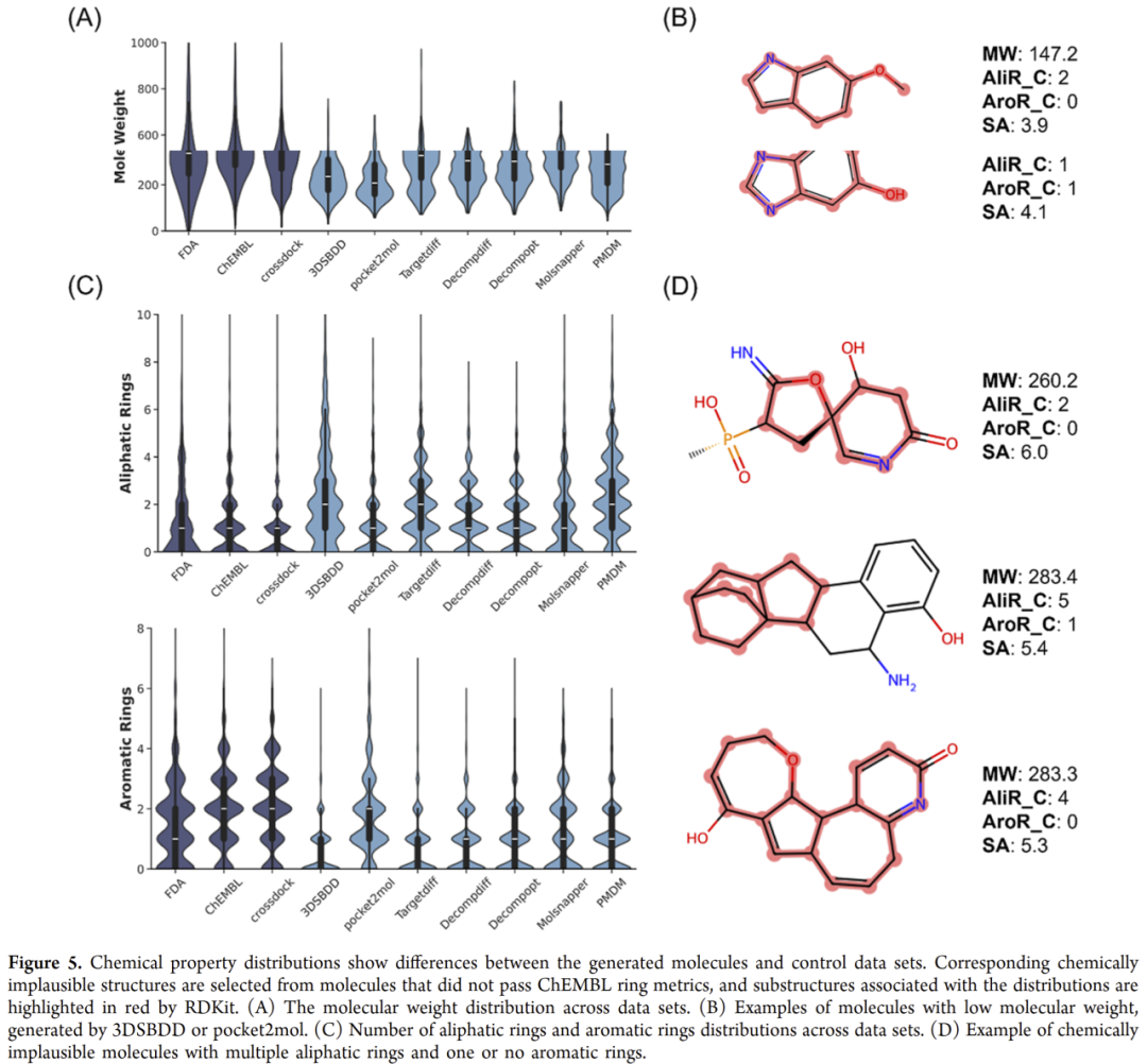 与真实药物相比,生成分子普遍表现为:
